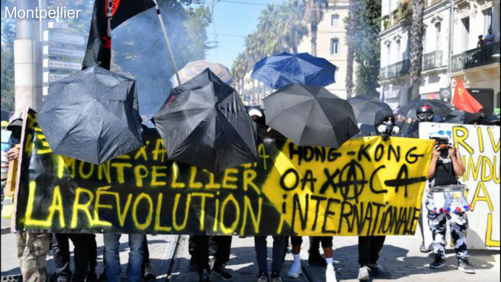 En France, des banderoles de cortège de tête continue de mentionner les luttes de Hong Kong, Irak, Chili…